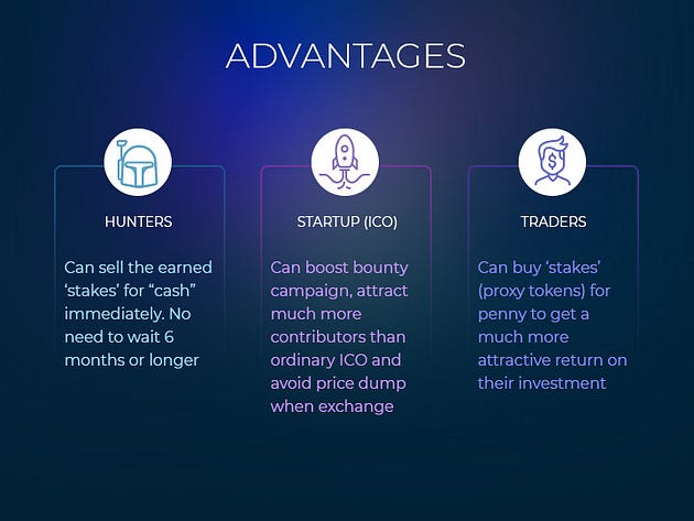 Благодаря торговле баунти ставками риск снижения цен, вызванный участниками баунти компании, будет снижен на 50%, поскольку нетерпеливые охотники продадут часть своих заработанных баунти ставок до начала распространения токенов.